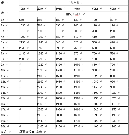 4.4 磁場強(qiáng)度:工作氣隙20mm時,80mm極頭中心磁場最大H≥2.2T